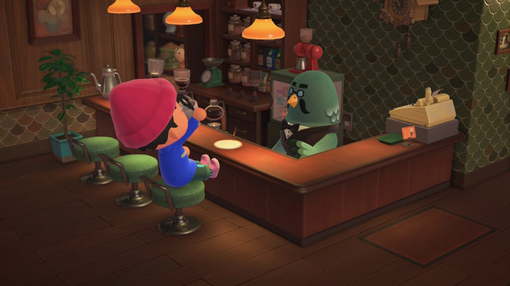 釣りや虫取り、DIYに走り回っていると、ついバタバタと忙しくなってしまいますが、喫茶ハトの巣に立ち寄ると自然と気持ちが落ち着いてきます。マスターのコーヒーを飲むだけで、ゲームの中なのに本当に香りが漂ってきそうな気分になるから不思議です。しかも絶対熱くてブラックです。(噂ではその内ミルクを追加できるようになるとか)