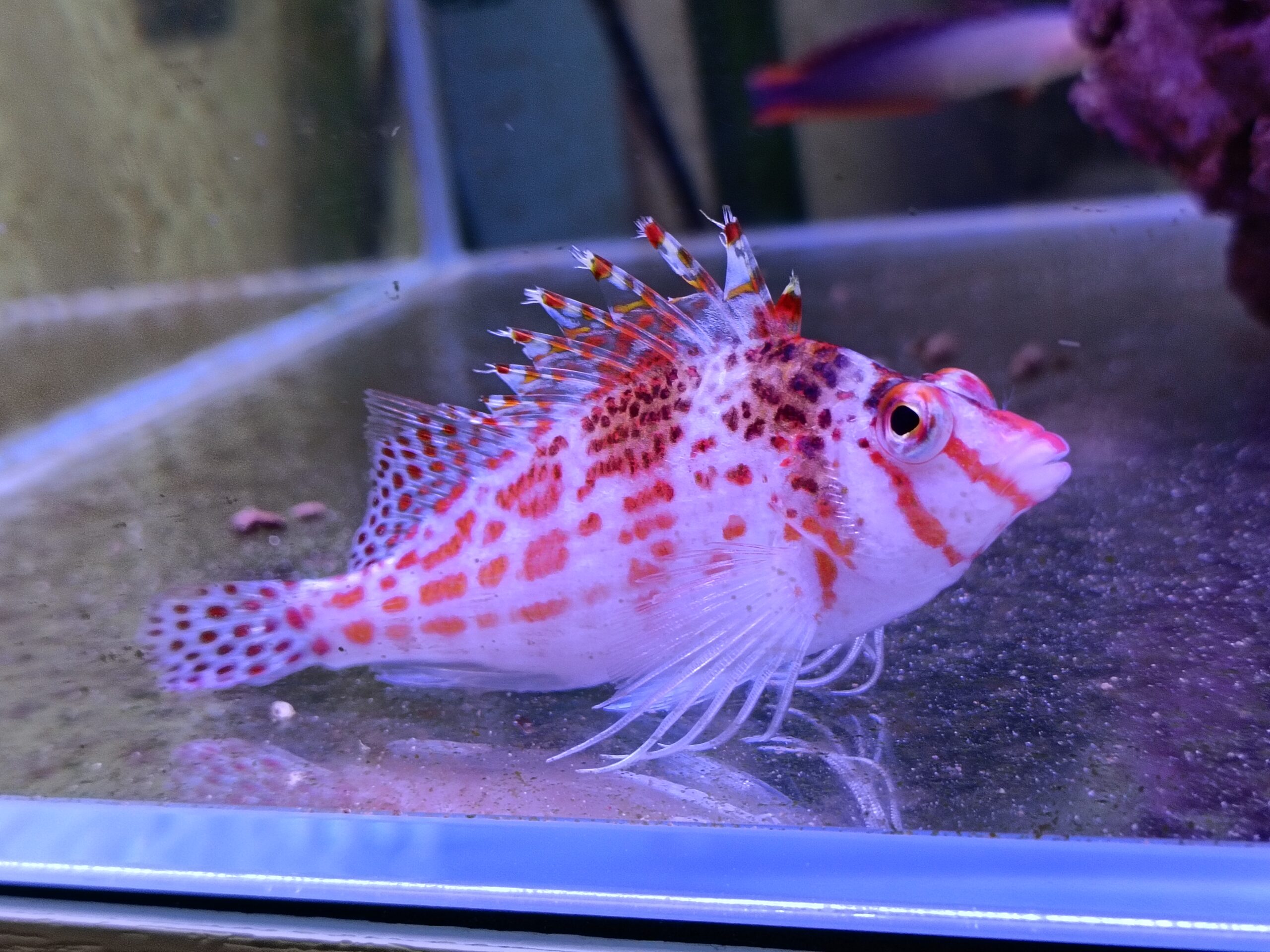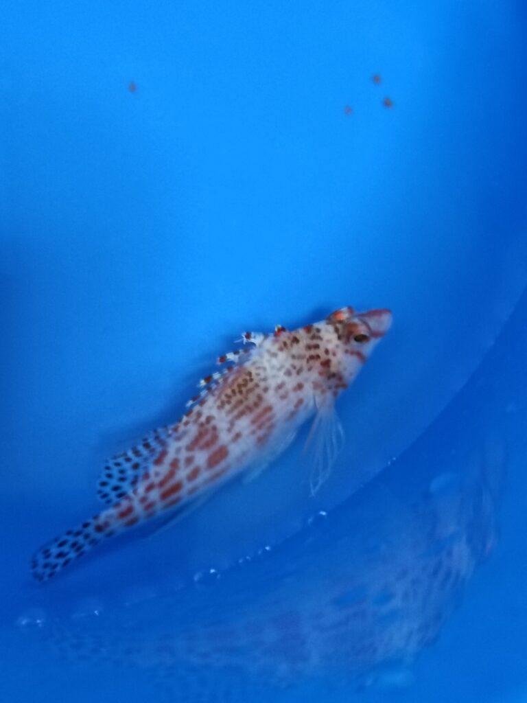 ちょこんと座る姿がとてもかわいらしく、動きもどこかコミカルで、つい目で追ってしまいます。水槽の前に立つとこちらをじっと見てくることがあり、その仕草に癒される瞬間が多いです。派手すぎない模様なのに存在感があり、落ち着いた雰囲気の中に愛嬌がある魚だと感じています。お迎えして良かったと思える一匹でもあります。あとは無事、完全に人工飼料に移行できるようにゆっくり飼育していきたいと思います。